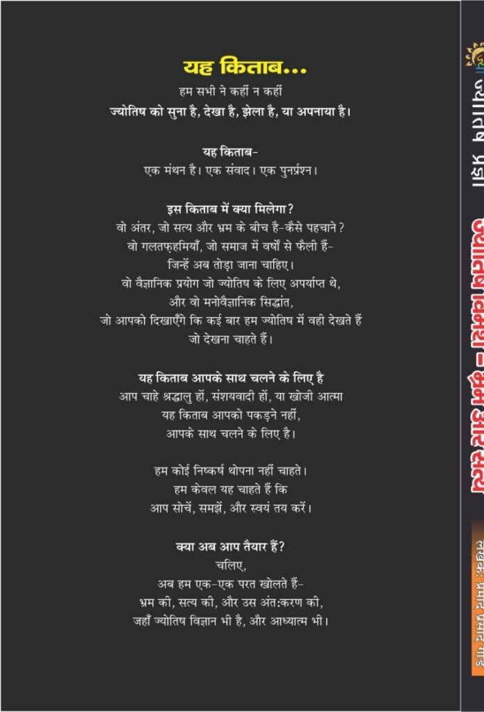 इस ग्रंथ का उद्देश्य न तो किसी मत को थोपना है, न ही किसी विमर्श को अंतिम सत्य के रूप में प्रस्तुत करना। यह केवल एक विनम्र प्रयास है—ज्योतिष के उस स्वरूप को सामने लाने का, जो तर्क, विज्ञान, अनुभव और परंपरा के समन्वय से जन्म लेता है।
